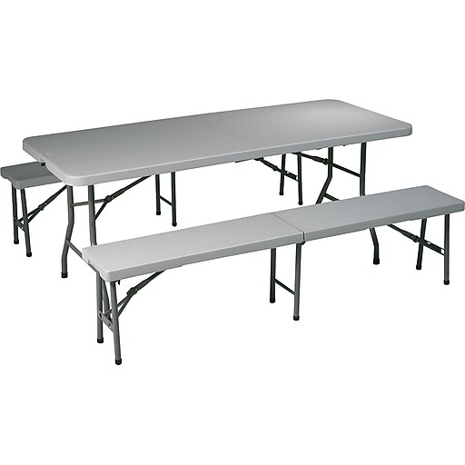 The cosco 3 piece indoor outdoor table and 2 bench tailgate set is the perfect set for any gathering. Provide staff and guests with a convenient place to sit, work, or enjoy some down time with this white plastic folding table with 2 benches. Hdx black plastic seat outdoor safe folding chair (set of 4) $99.71. Static load capacity, 1.5 thick seat. The benches can be stored underneath the table for added convenience.